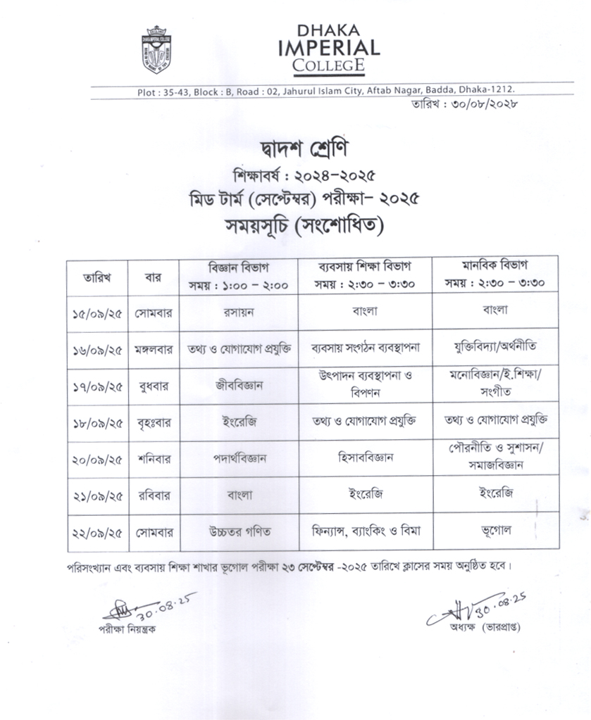 মিড টার্ম (সেপ্টেম্বর) পরীক্ষা-২০২৫ এর (সংশোধিত)সময়সূচী Share this:Click to share on Twitter (Opens in new window)Click to share on Facebook (Opens in new window)Click to share on Google+ (Opens in new window)Like this:Like Loading... Related August 30, 2025 | Notice Board |
